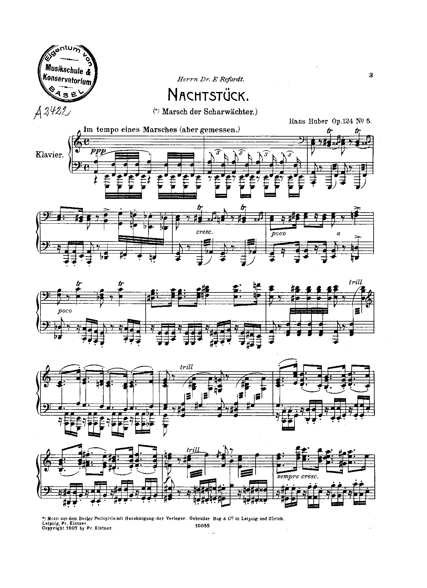 Edgar Refardt (dedicatee of the Nachtstück of this set; also author of the article on Huber in Monographie..., C.F. Kahnt, 1906) - in his 1944 study "Hans Huber; Leben und Werk eines Schweizer Musikers" - is cited by RISM as a source. (This editor had thought that perhaps the Oct. 1903 etudes Refardt mentions in the 1906 article - as not (yet!) - published - might have been these - but they are also listed (in sketch anyway) at RISM (RISM 402005040), as a set with contents and dedication (to Busoni) listed, and are not the same works (though some of the titles are the same.) - Schissel