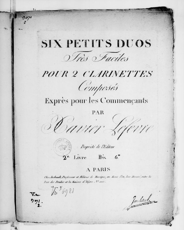 | Alternative. Title | Six petits duos, 2e livre, Six petits duos très faciles pour deux clarinettes, composés exprès pour les commençants |