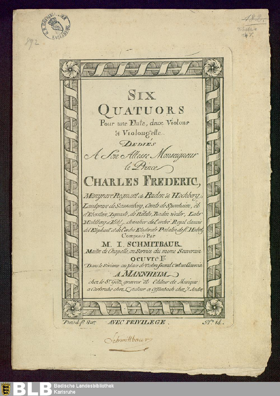 | Alternative. Title | Six Quatuors pour une flute, deux violons et violongelle [sic] ... par M. I. Schmitbaur ... Dans le Sixieme au place de Violon second c'est un Clavecin |