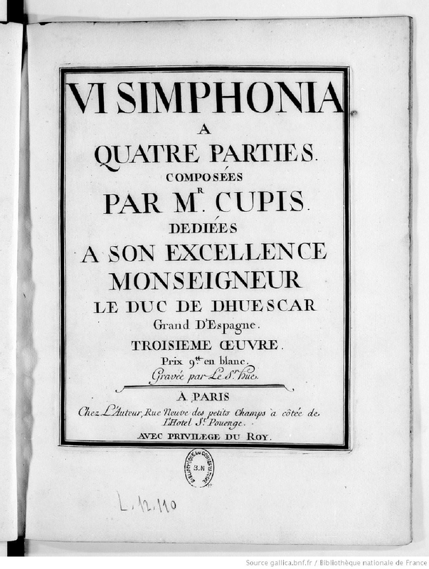 | Alternative. Title | VI Simphonia a quatre parties composees par Mr. Cupis |