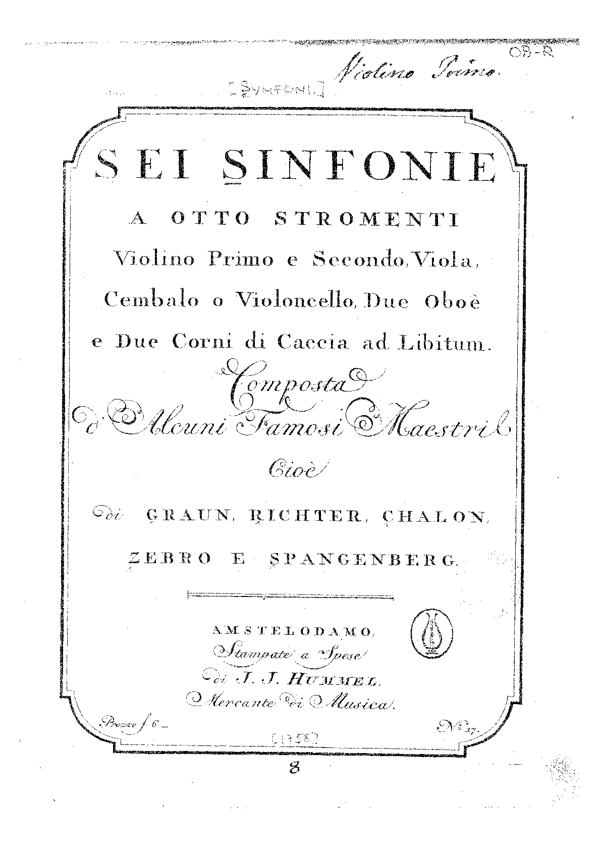 | Alternative. Title | Sei Sinfonie a otto stromenti Violino Primo e Secondo, Viola, Cembalo o Violoncello, Due Oboe Due Corni di Caccia ad Libitum. Composta d'Alcuni Famosi Maestri cioe di Graun, Richter, Chalon, Zebro e Spangenberg |