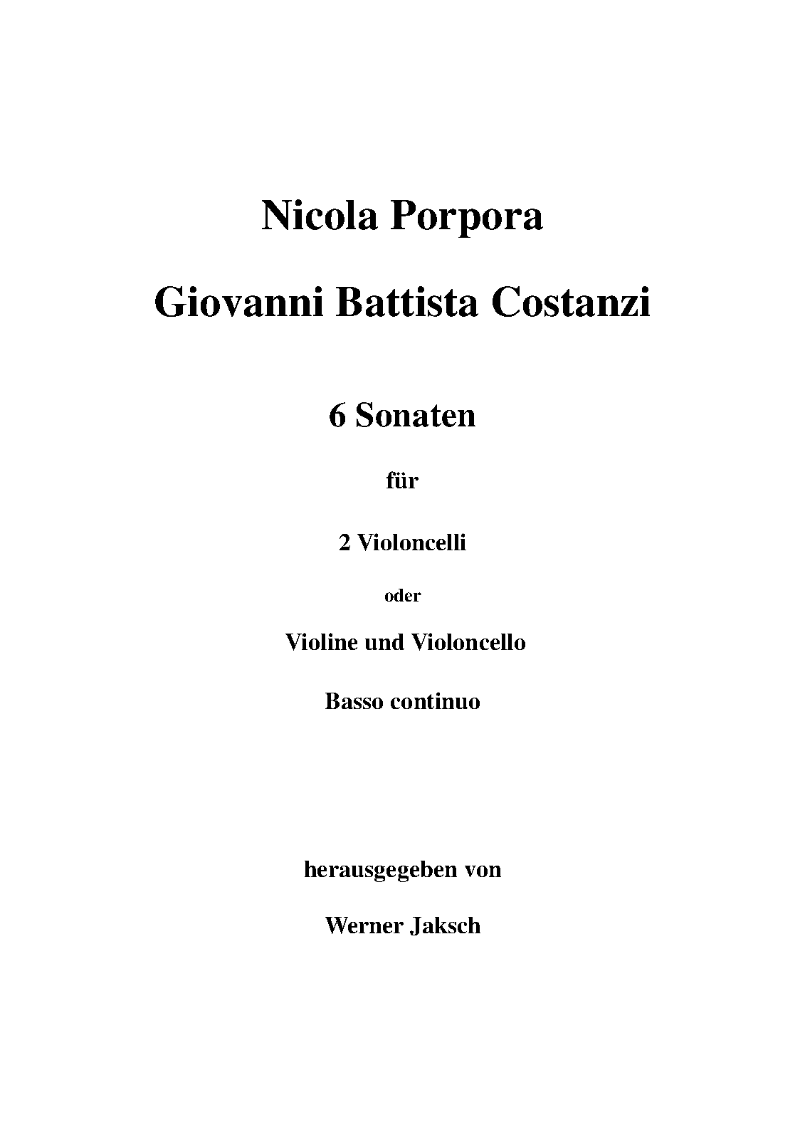 | Extra Information | Composed by Nicola Porpora and Giovanni Battista Costanzi (Costanza). Note: Violin 1 and 2 are the same part. The original title-page is quite ambiguous. This should actually be named Sonata for Violin, Cello and Basso Continuo. |