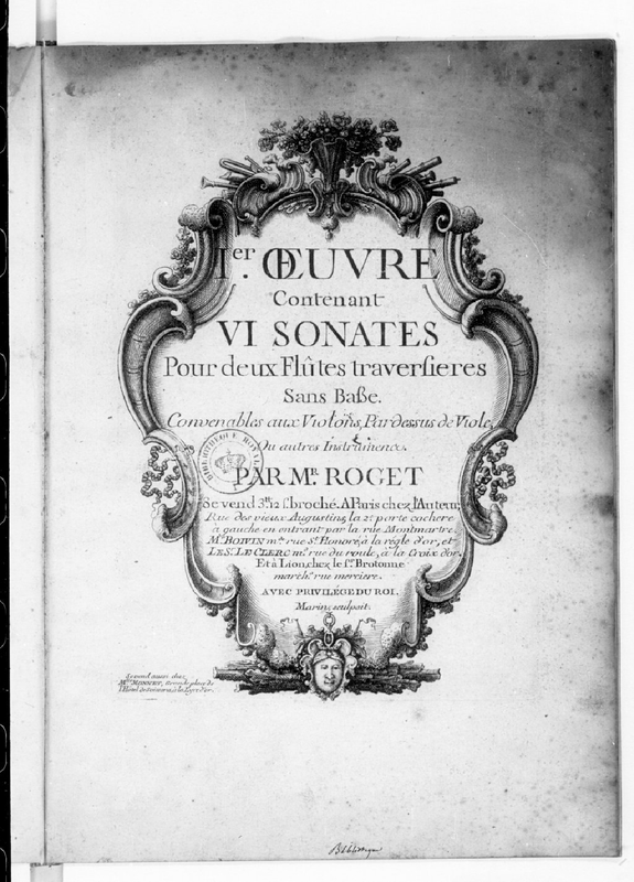 Ier. Oeuvre Contenant VI Sonates pour deux Flûtes traversieres sans Basse. Convenables aux Violons, Pardessus de Viole, ou autres Instrumens.