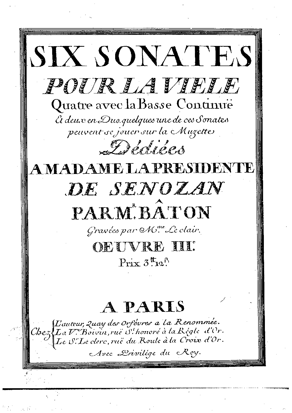 6 Sonates pour la Viele, 4 avec la Basse Continue, et 2 en duo. Quelques une de ces Sonates peuvent se jouer sur la Muzette