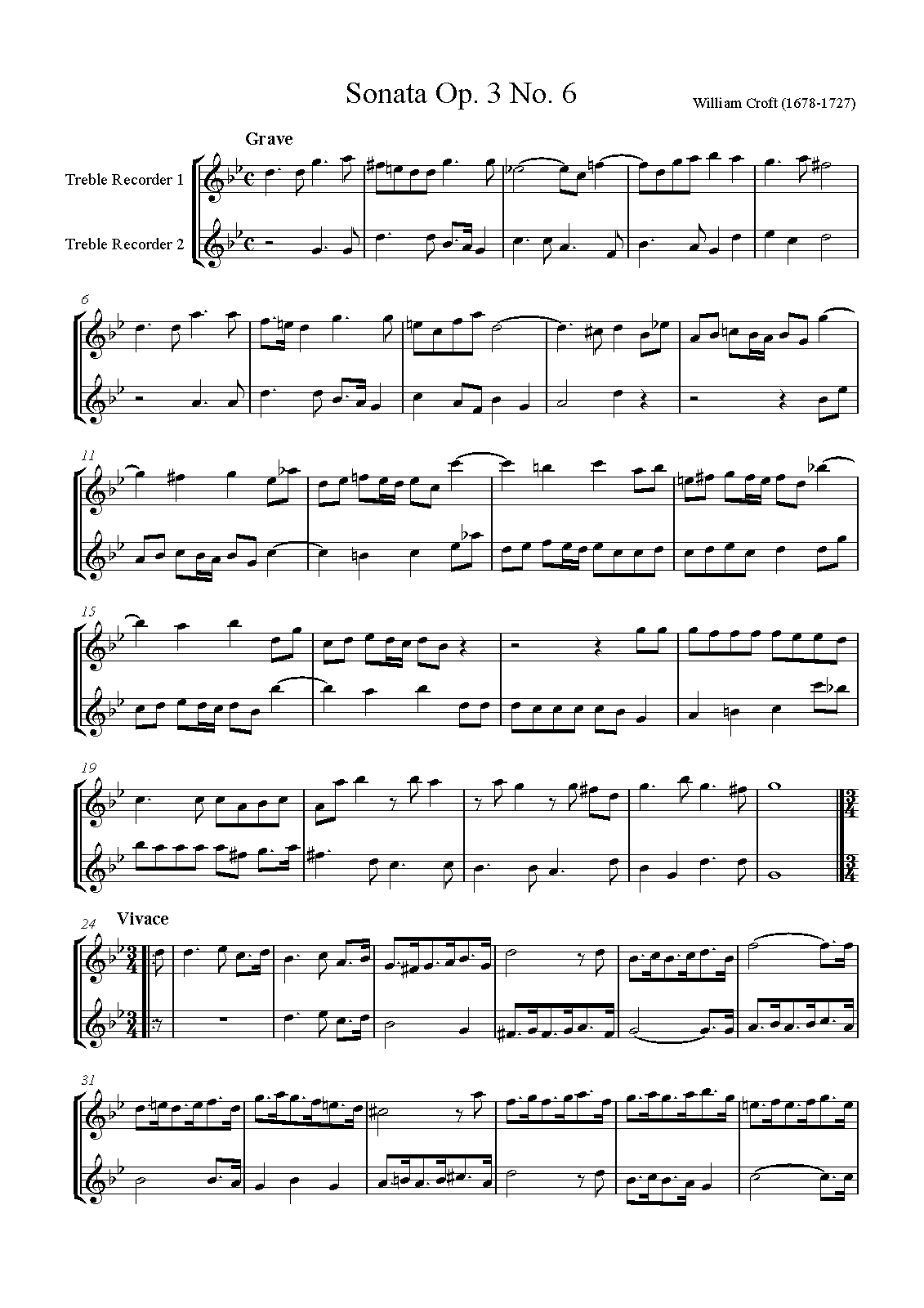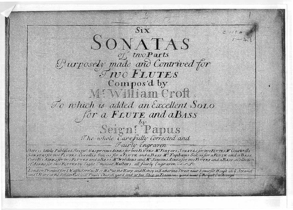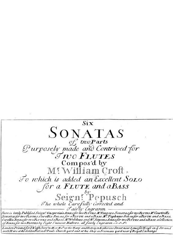 | Alternative. Title | Six Sonatas of Two Parts Purposely made and contained for Two Flutes Compos'd by Mr. William Croft To which is added an Excellent Solo for a Flute and a Bass by Seingr. Papus [= Pepusch] The whole Carefully Corrected and Fairly Engraven. |