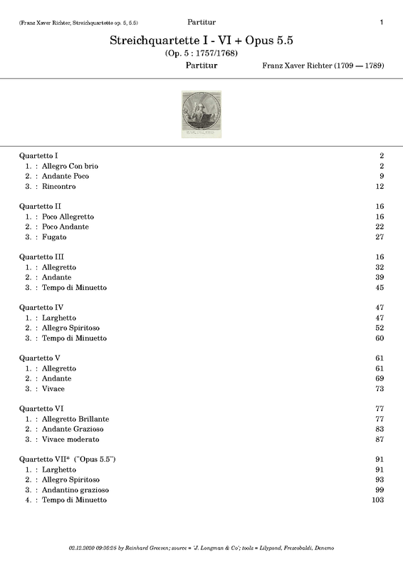 | Extra Information | *Except for the first these were reissued in 1772 by La Chevardiere (Paris) as Op.5, but in a different order (G B♭ A D g E♭), substituting the String Quartet in G minor for the C major. |