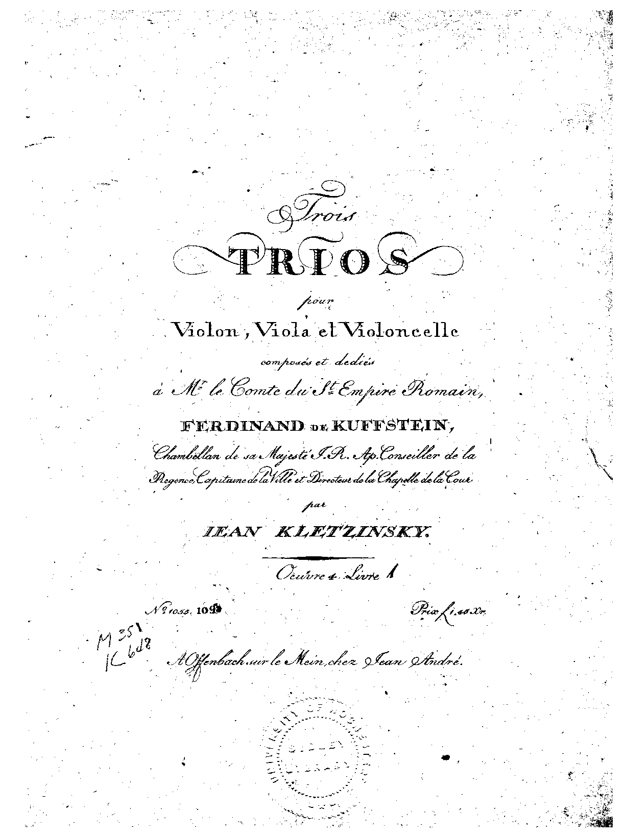 | Dedication | Mr. le Comte du St. Empire Romain, Ferdinand de Kuffstein, Chambellan de sa Majeste J.R. Ap. Conseiller de la Regence, Capitaine de la Velle et Directeur de la Chapelle de la Cour |