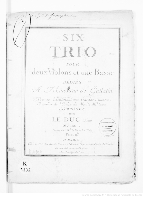 | Alternative. Title | Six Trio pour deux Violons et une Basse |