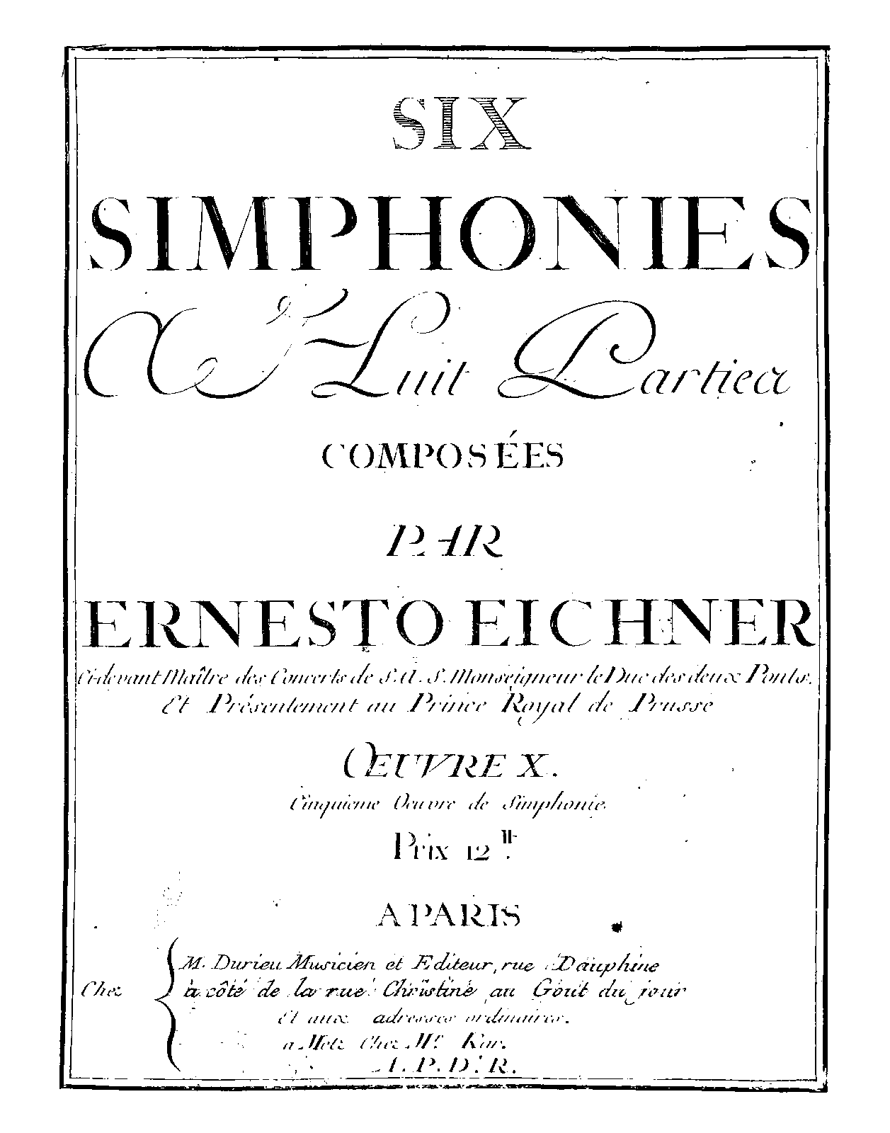 | Alternative. Title | Six simphonies a huit parties, oeuvre X, cinquieme oeuvre de simphonie composées par Ernesto Eichner |