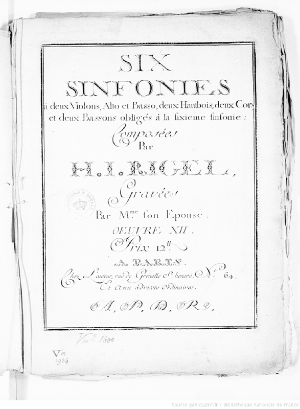 | Alternative. Title | Six Sinfonies a deux Violons, Alto et Basso, deux Hautbois, deux Cors et Deux Bassons obliges a la sixieme sinfonie |