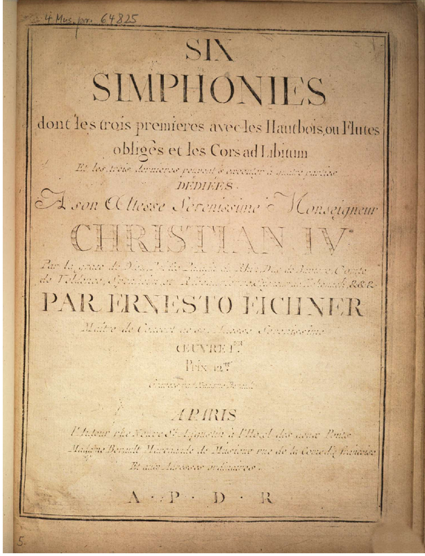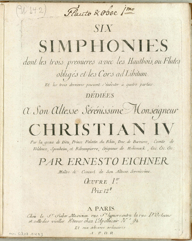 | Alternative. Title | 6 simphonies dont les 3 premieres avec les hautbois, ou flutes obligés et les cors ad libitum: Et les 3 dernieres peuvent s’éxécuter à 4 parties, Oeuvre Ier. |
