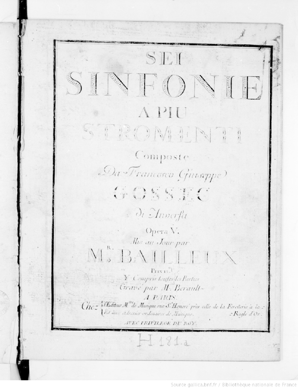 The title of the ensuing Opus 6 Six symphonies dont les trois premières avec des hautbois obligés et des cors ad lib., et les trois autres en quatuor op. 6, (vers 1762, Paris, Bailleux éditeur) might seem to support the omission of oboes in the present publication.