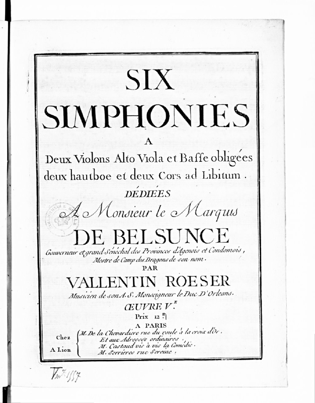 Six Simphonies a deux violons, alto viola et basse obligees, deux hautboe et deux cors ad libitum