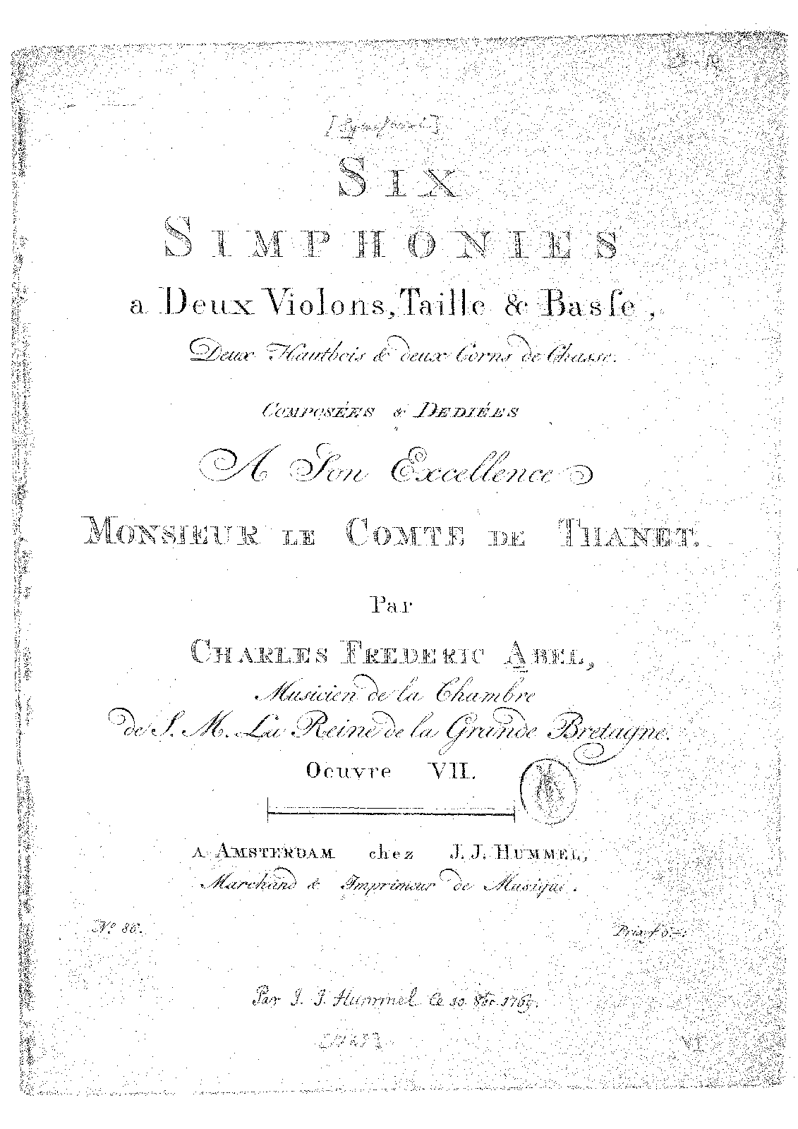 Six Simphonies a Deux Violons, Taille & Basse. Deux Hautbois & deux Corns de Chasse
