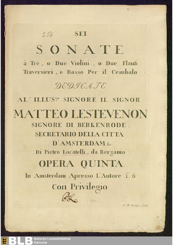 Source : Sei sonate a tre, o due violini, o due flauti traversieri, basso per il cembalo... opera quinta Amsterdam, autor - RISM : L 2610