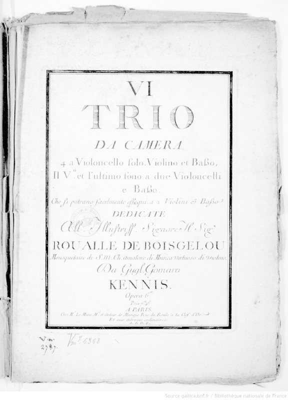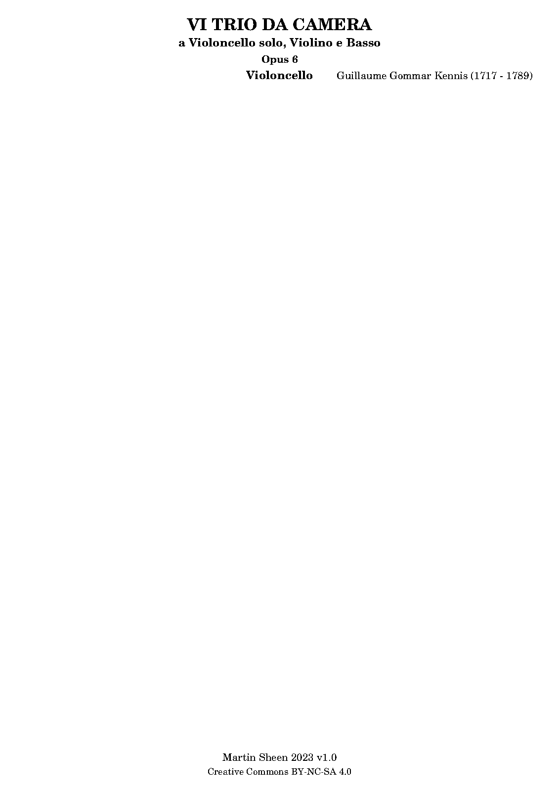 | Alternative. Title | VI Trio da camera. 4 a Violoncello solo, Violino et Basso, il Vo. et l'ultimo sono a due Violoncelli e Basso. Che si potrano facilmente essequi a 2 Violini e Basso |