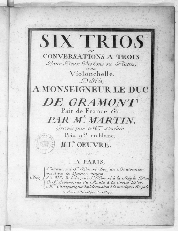 | Alternative. Title | Six Trios ou Conversations a trois pour deux violons ou fluttes, et un violonchelle |