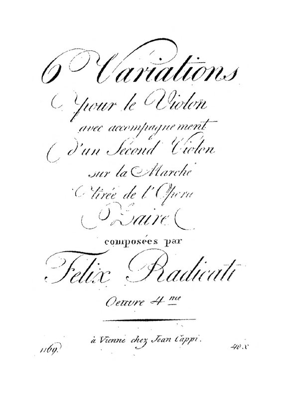 | Alternative. Title | 6 Variations pour le Violon avec accompagnement d'un Second Violon, sur la Marche tiree de l'Opera Zaire |