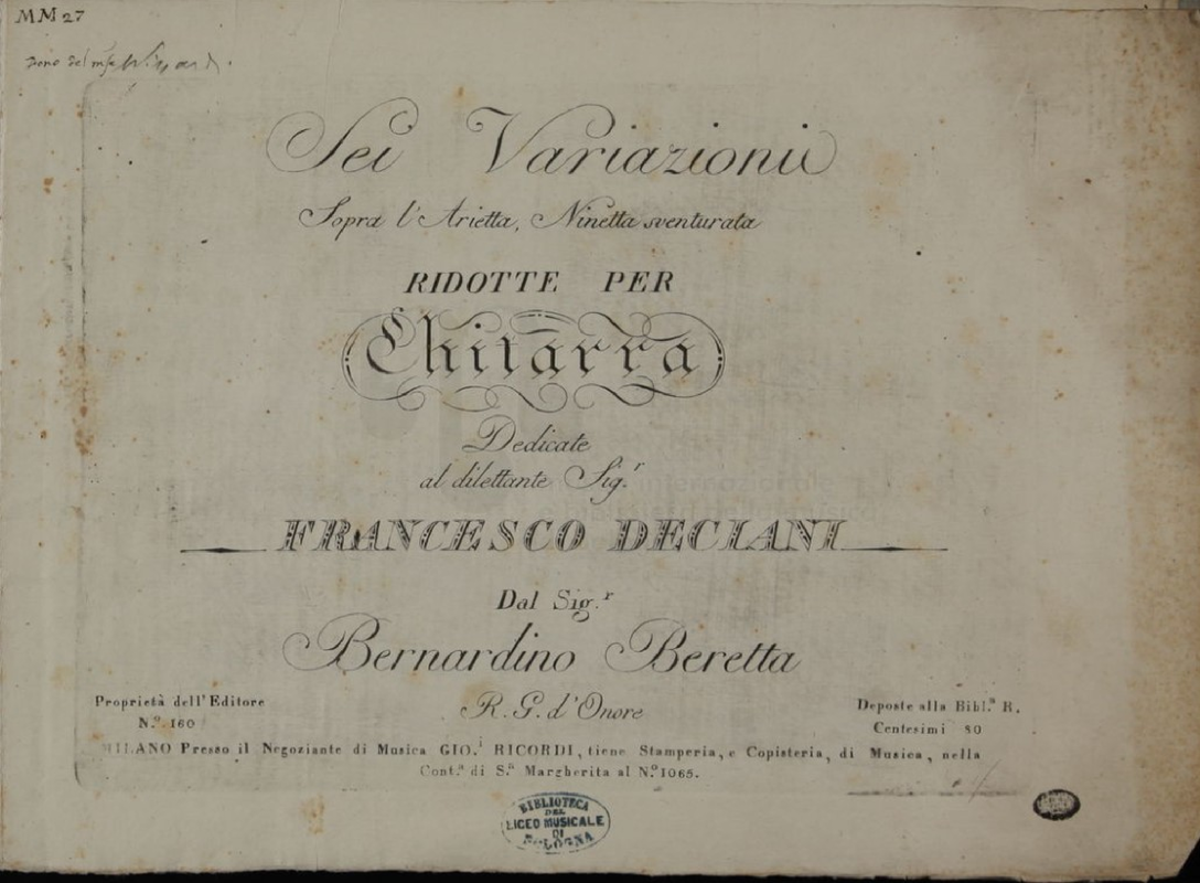 | Work Title | 6 Variazioni sopra l'Arietta Ninetta sventurata ridotta per Chitarra |