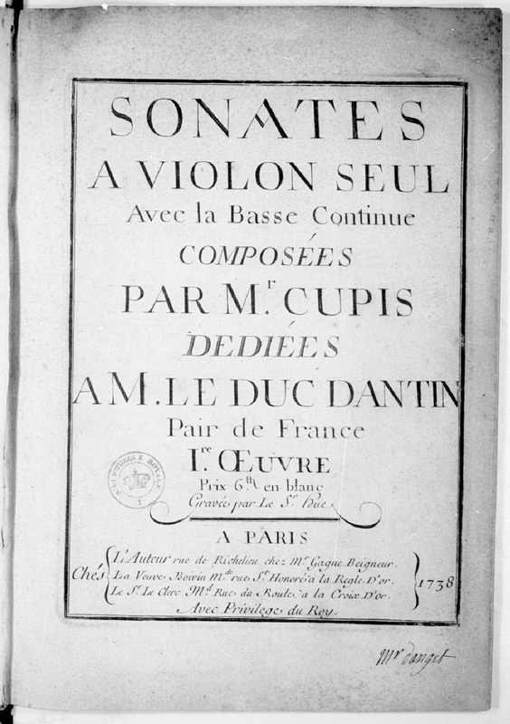 Sonates a violon seul avec la basse continue composées par Mr. Cupis