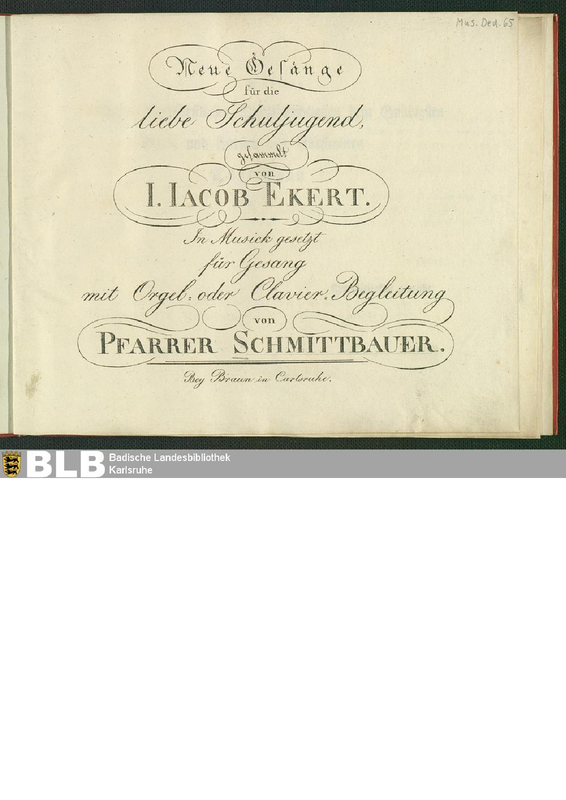 Neue Gesänge für die liebe Schuljugend gesammelt von I. Iacob Ekert. In Musick gesetzt für Gesang mit Orgel- oder Clavier-Begleitung von Pfarrer Schmittbauer
