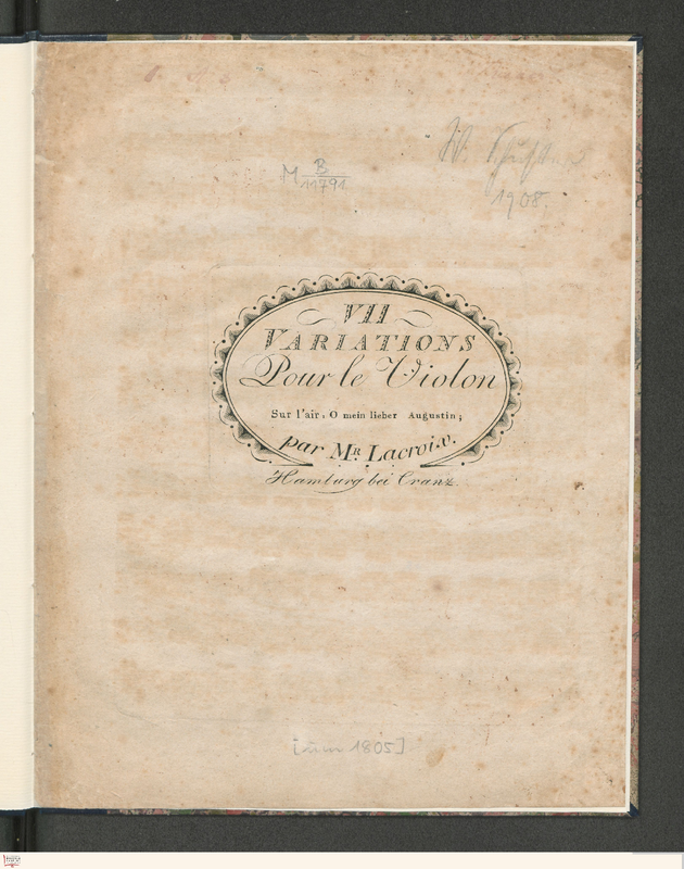 | Alternative. Title | VII Variations pour le violon sur l'air: O mein lieber Augustin; par Mr. Lacroix |