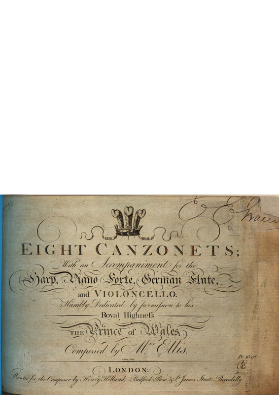 | Alternative. Title | Eight Canzonets; with an Accompaniment for the Harp, [or] Piano Forte, German Flute, and Violoncello ... composed by Mrs. Ellis |