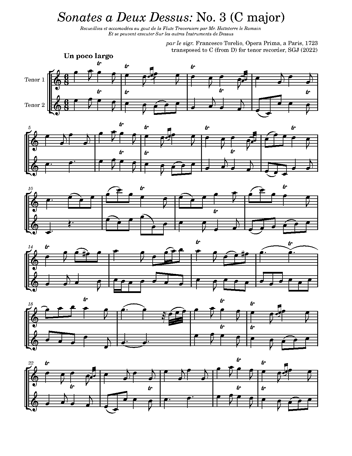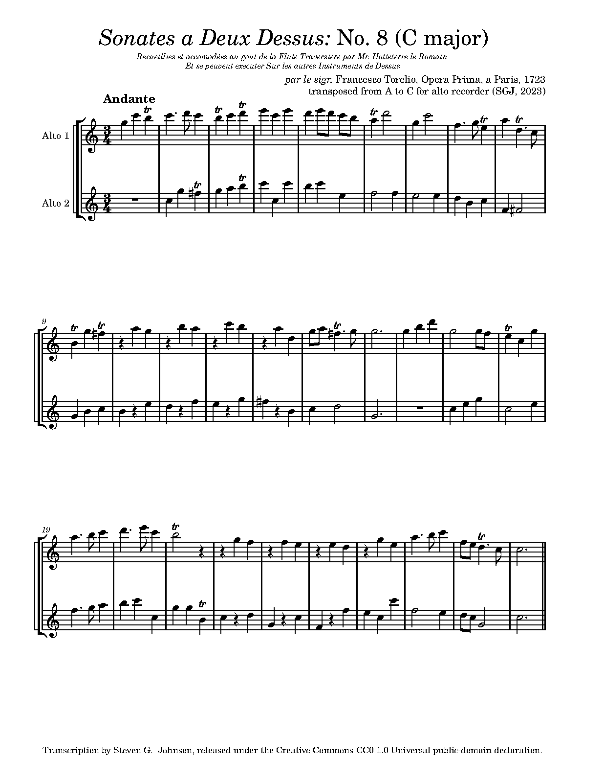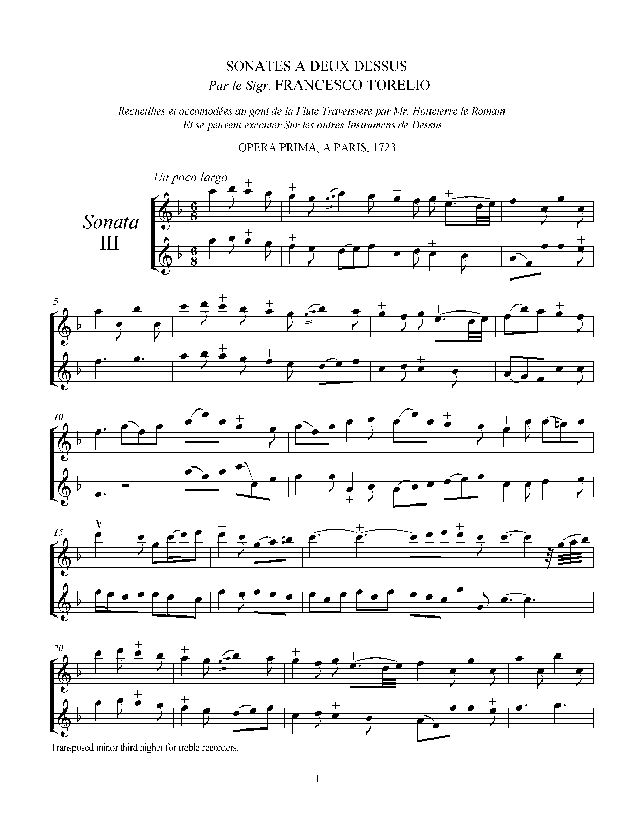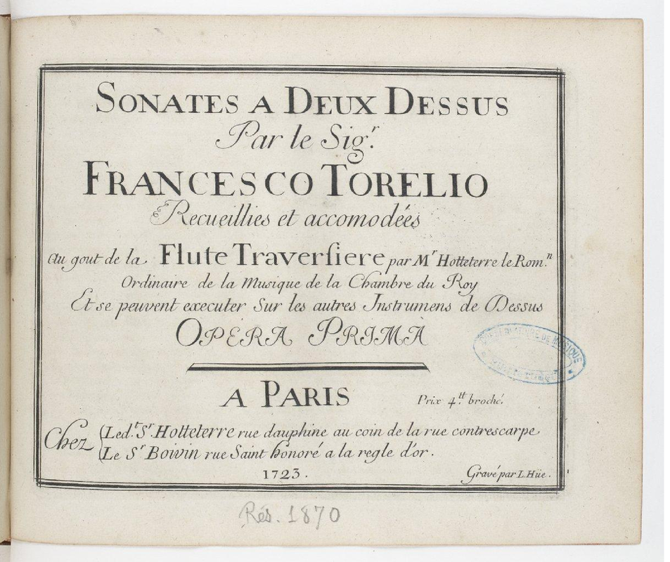 | Alternative. Title | Sonates a Deux Dessus [...] Recueillies et accomodées au gout de la Flute Traversiere par Mr. Hotteterre le Romn. Ordinaire de la Musique de la Chambre du Roy. Et se peuvent executer sur les autres Instrumens de Dessus. Opera Prima |
