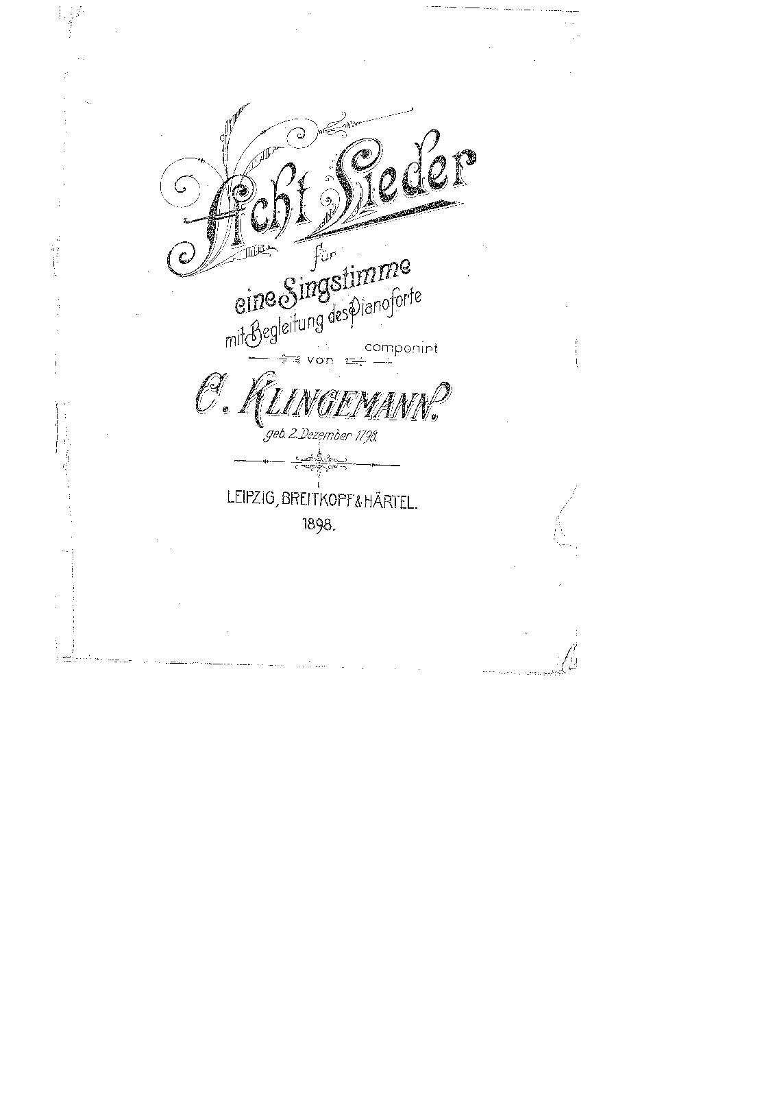 | Extra Information | New edition of some of Klingemann's songs, on the occasion of his 100th birthday. There was an earlier edition by Breitkopf & Härtel, dedicated to "Frau Henriette Benecke born Souchay", most probably published while Klingemann was still alive, but not in the contributor's hands. |