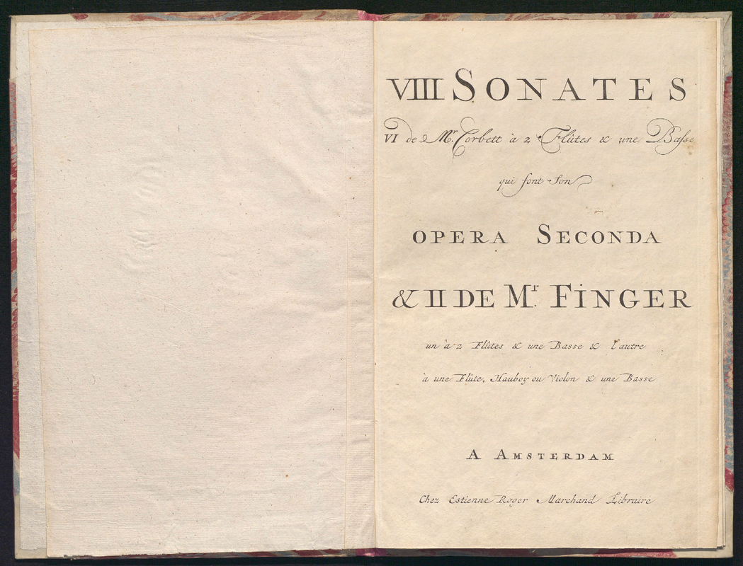 | Alternative. Title | VIII Sonates. VI de Mr Corbett a 2 Flutes & une Basse qui sont son opera seconda & II de Mr Finger, un a 2 flutes & une basse & l'autre a une flute, hauboy ou violon & une basse |