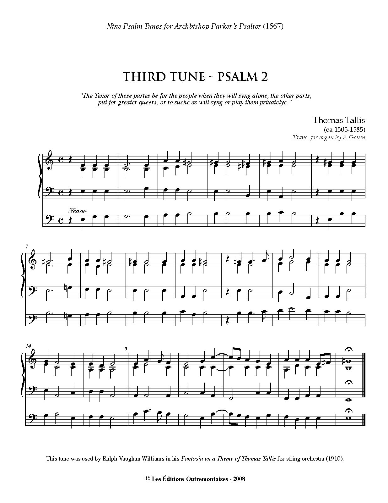 The Third Tune (Ps.2) was used by Ralph Vaughan Williams in his 1910 string orchestra piece, Fantasia on a Theme by Thomas Tallis.