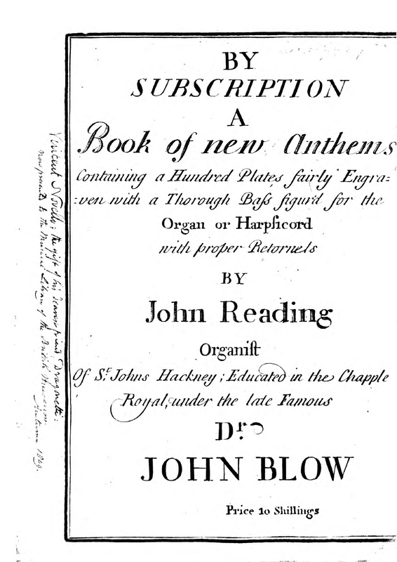 | Work Title | By Subscription A Book of new Anthems Containing 100 Plates fairly Engraven with a Thorough Bass figured for the Organ or Harpsicord with proper Retornels |
