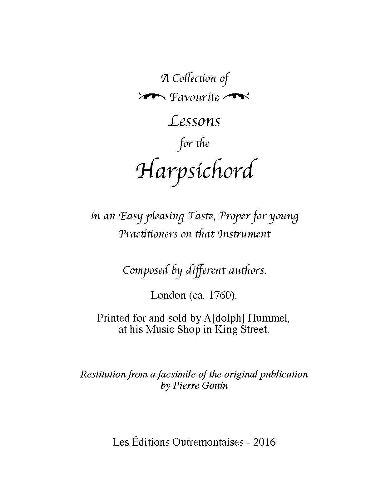 | Alternative. Title | A Collection of Favourite Lessons for the Harpsichord in an Easy pleasing Taste, Proper for young Practitioners on that Instrument, Composed by different authors. |