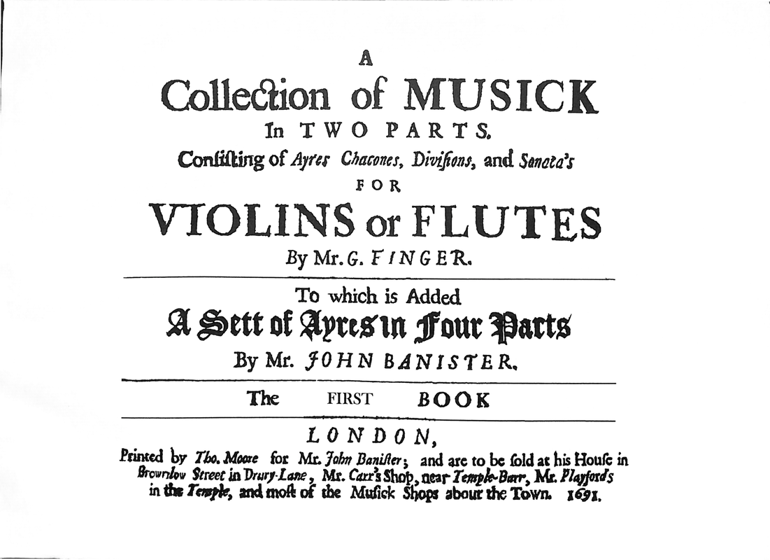 | Alternative. Title | A Collection of Musick in Two Parts. Consisting of Ayres, Chacones, Divisions, and Sonata's [sic] for Violins or Flutes [i.e. recorders] by Mr. G. Finger. To which is Added A Sett of Ayres in Four Parts by Mr. John Banister |