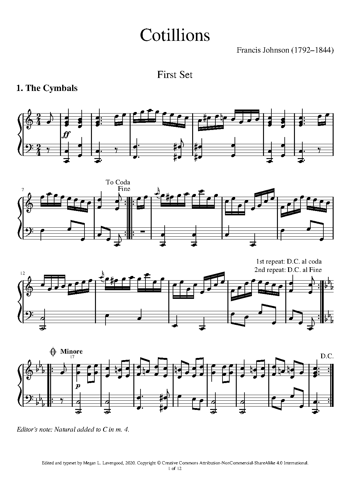| Alternative. Title | A Collection of New Cotillins [sic - cotillons] Published by setts, Composed by F. Johnson A Collection of New Cotillions |