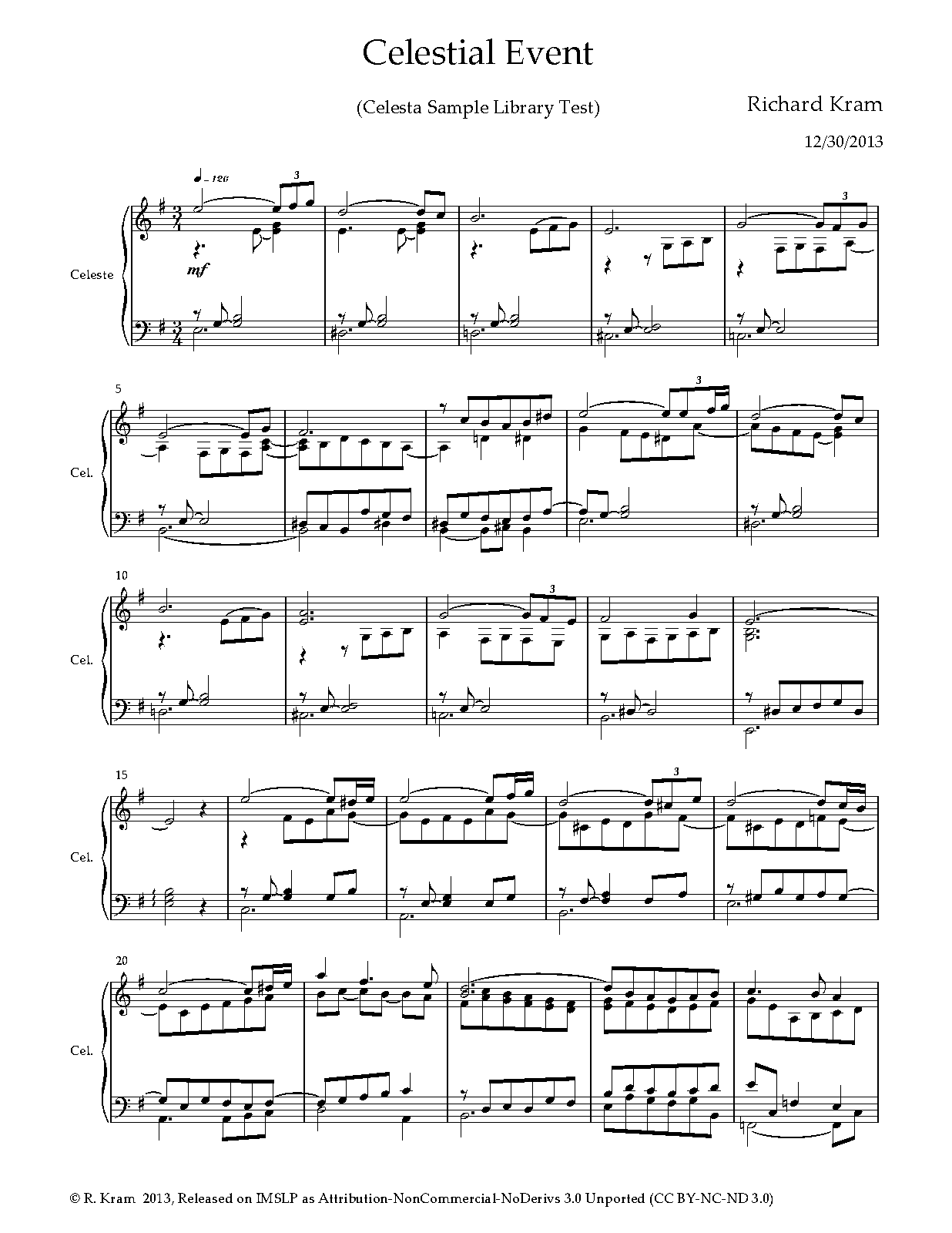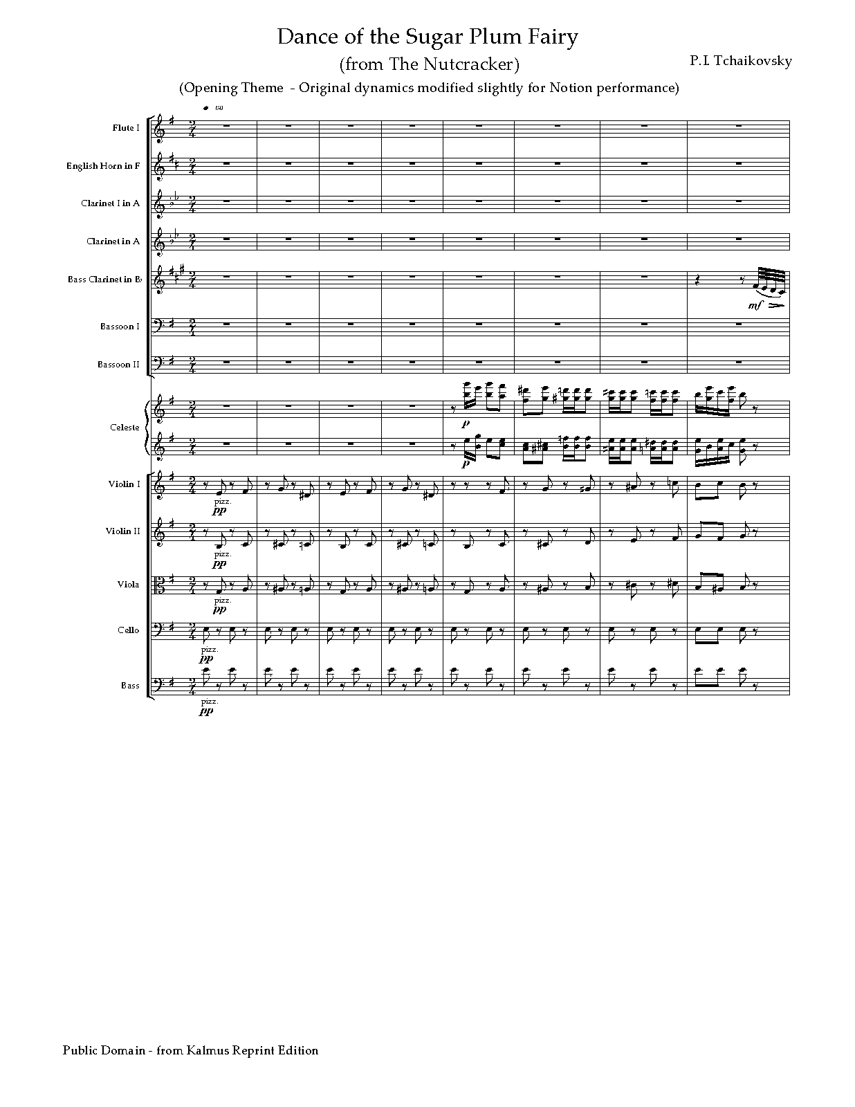 All orchestra parts except the Sibelius version were played in Notion4 (with East West Spaces convolution reverb added). The Sibelius version uses the Sibelius Standard orchestral library. Tried to normalize volume of celesta as best I could across different versions. Did not try and tweak individual notes of the celesta part so you can get a better idea of the "out-of-the-box" sound. Also note different libraries may need octave adjusting for celesta part.