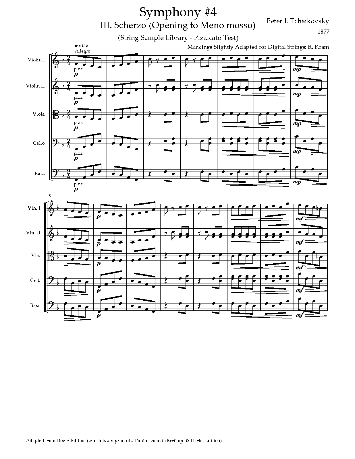 If you want a Pizzicato test, you have to include this piece. Added a few extra markings for better dynamics and articulations for notation packages (Notion, Sibelius, etc). Just the first section up to the Meno mosso.
