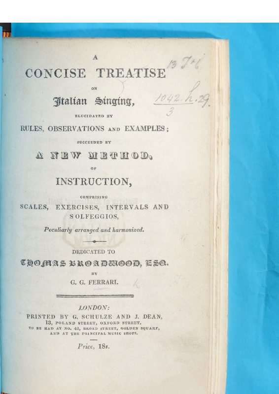 | Alternative. Title | A Concise Treatise on Italian Singing, elucidated by rule, observations and examples; succeeded by a new method, of instruction, comprising scales, exercises, intervals and solfeggios, peculiarly arranged and harmonized. |
