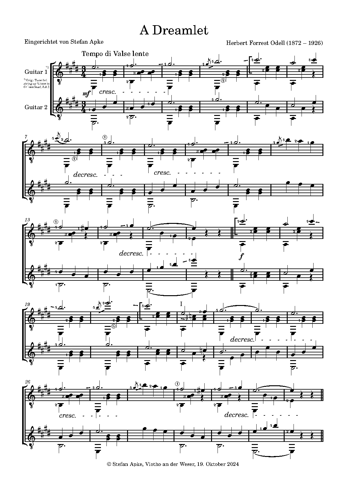 I was able to find two historical performances of A Dreamlet in versions for guitar trio and octet, respectively (see below). It is unclear whether Odell himself had a hand in either of these.