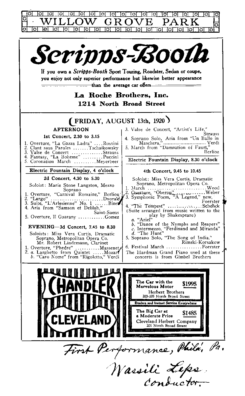 1921/8/13 — Willow Grove Park: Wassili Leps (conductor) — A Legend (as Op.86)