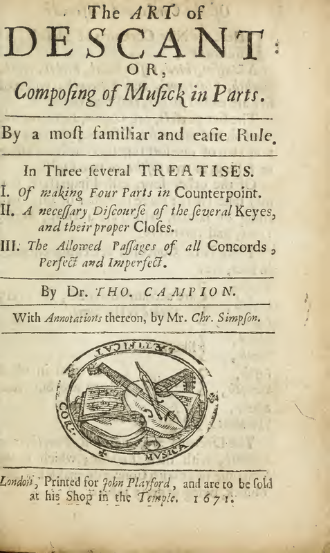 Title: The Art of Descant: or, Composing Musick in Parts. By a most familiar and easie Rule. In Three several Treatises. I. Of making Four Parts in Counterpoint. II. A necessary Discourse of the several Keyes, and their proper Closes. III. The Allowed Passages of all Concords, Perfect and Imperfect. By Dr. Tho[mas]. Campion. With Annotations thereon, by Mr. Chr. Simpson.
