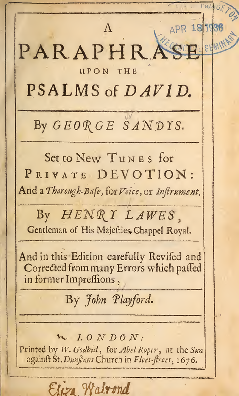 Title-page transcription Psalmody for a single voice, being 24 melodies for private devotion, with a base for voice or instrument; First Published with Mr. George Sandys's "Paraphrase of the Psalms of David" in the year 1638. By Henry Lawes, Gentleman of his Majesty's Chapel Royal. With a Variation of each Psalm Tune on the same Page, by Matthew Camidge, Lately one of the Children of the same Chapel Royal. To which are prefixed some Introductory Remarks for this Publication, by W. Mason, M.A., Precentor of York.</span>