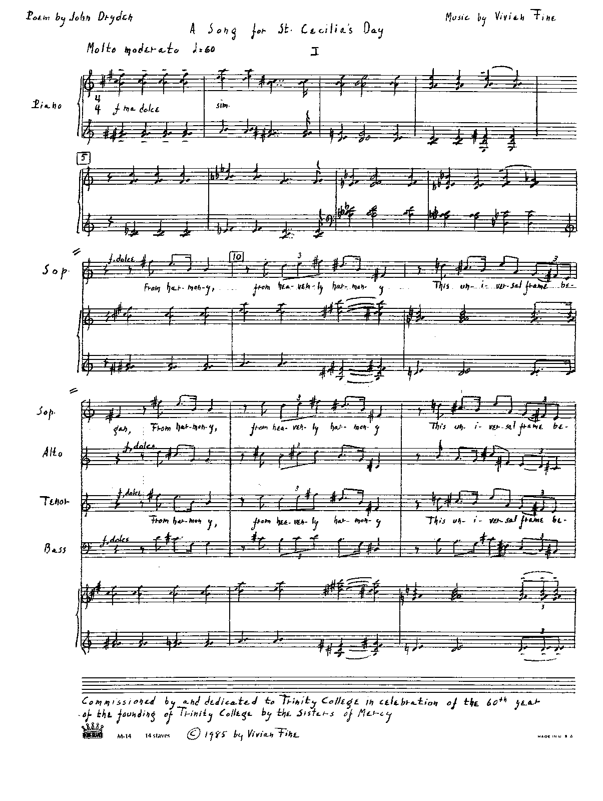 Commissioned by Trinity College, Burlington, Vermont, in honor of its 60th anniversary, with a grant from the Vermont Council for the Arts.