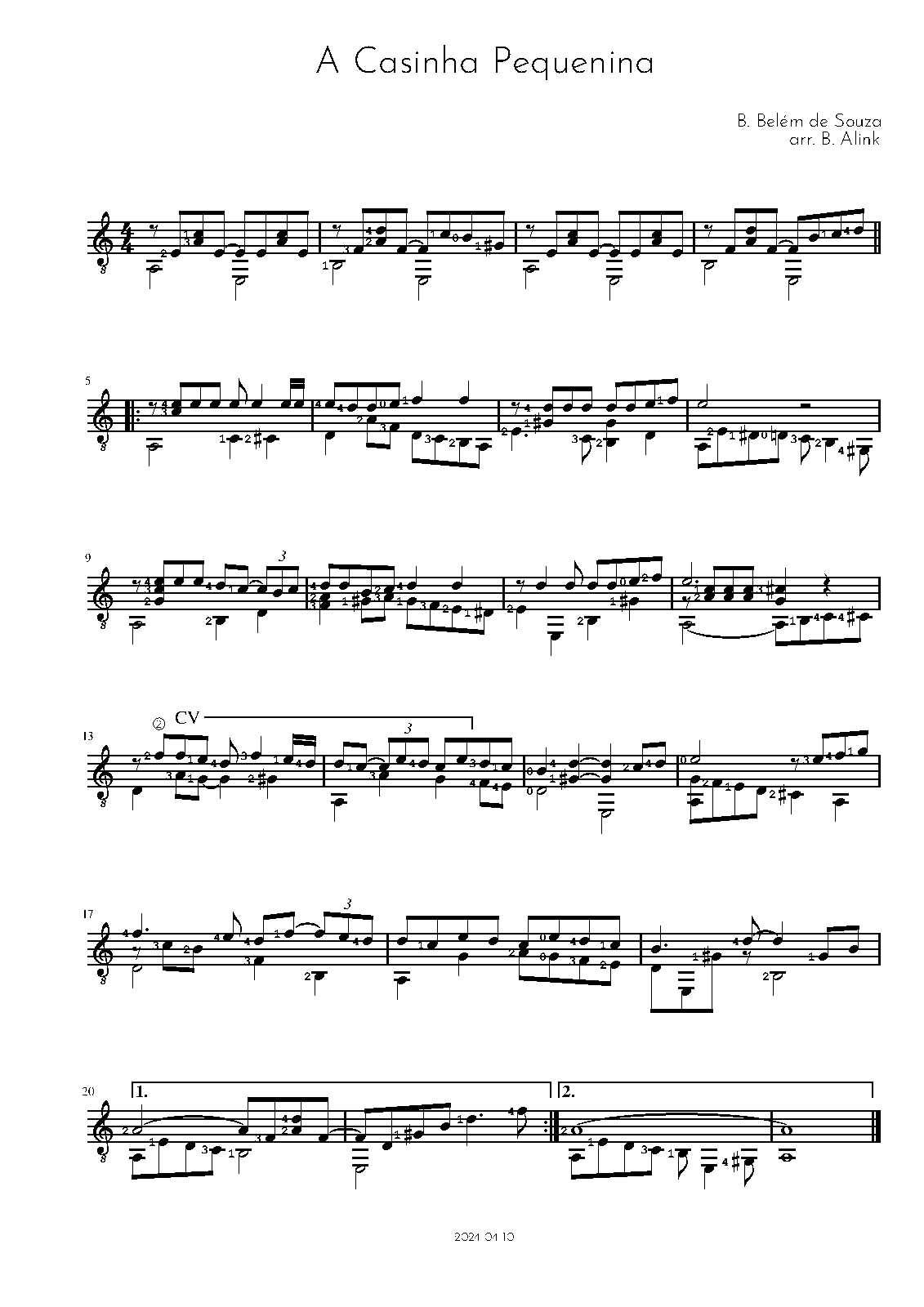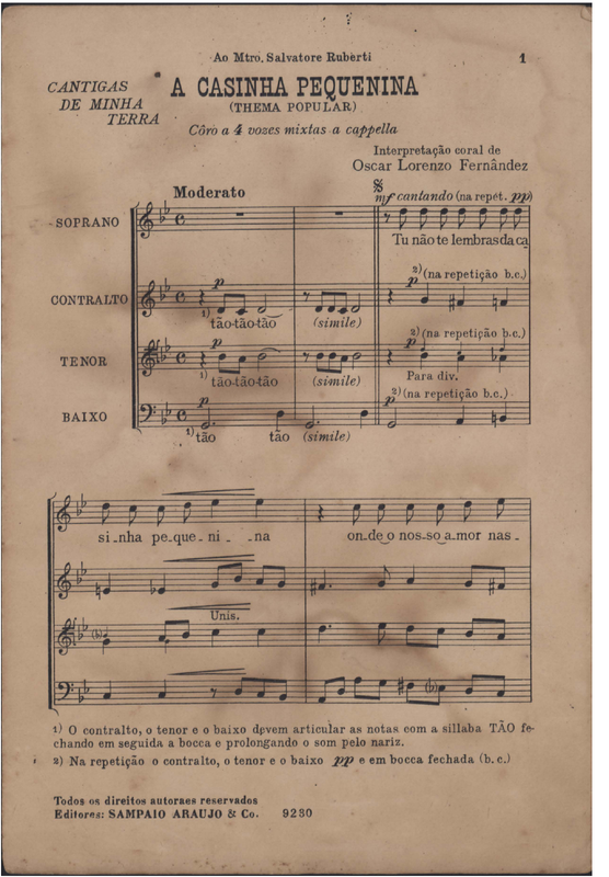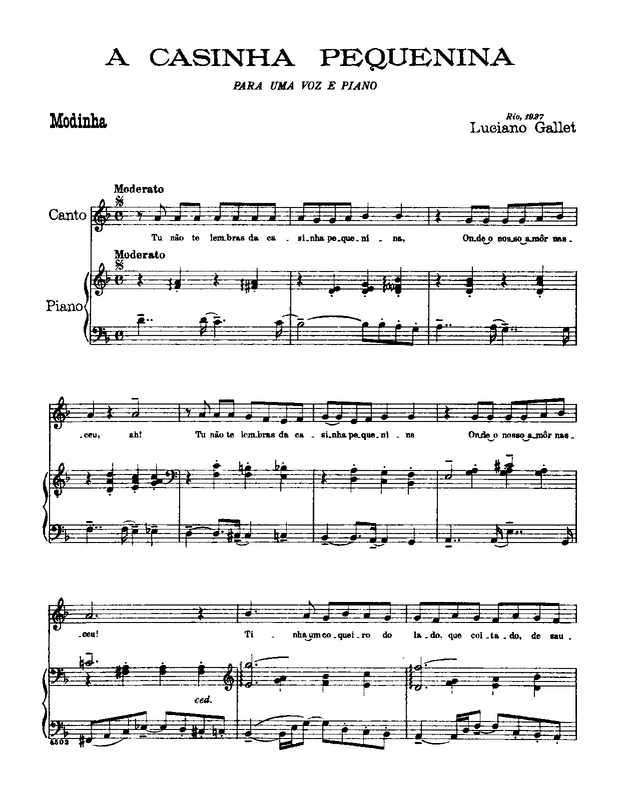 | Instrumentation | unknown; see below, Comments. The earliest entry on WorldCat is a recording from "[196-?] is for voice and orchestra. But since this seems to have been first published in 1920. Further, the uploader feels that "It's a popular Brazilian song, and is most likely that it was originally composed without score (from the oral tradition), and diffused by different ways and popular instrumental formations, persisting the song aspect and lyrics." See the following links for a discussion of the composer of this work: source no.1, and source no.2 |