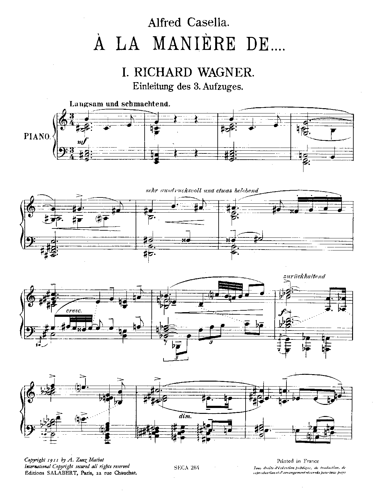 | Extra Information | Published in 2 volumes with the following titles (by Casella--2nd vol. included the 2 "A la manière de..." by Maurice Ravel): Wagner, Fauré, Brahms, Debussy, Strauss, Franck, Ravel, & d'Indy. |