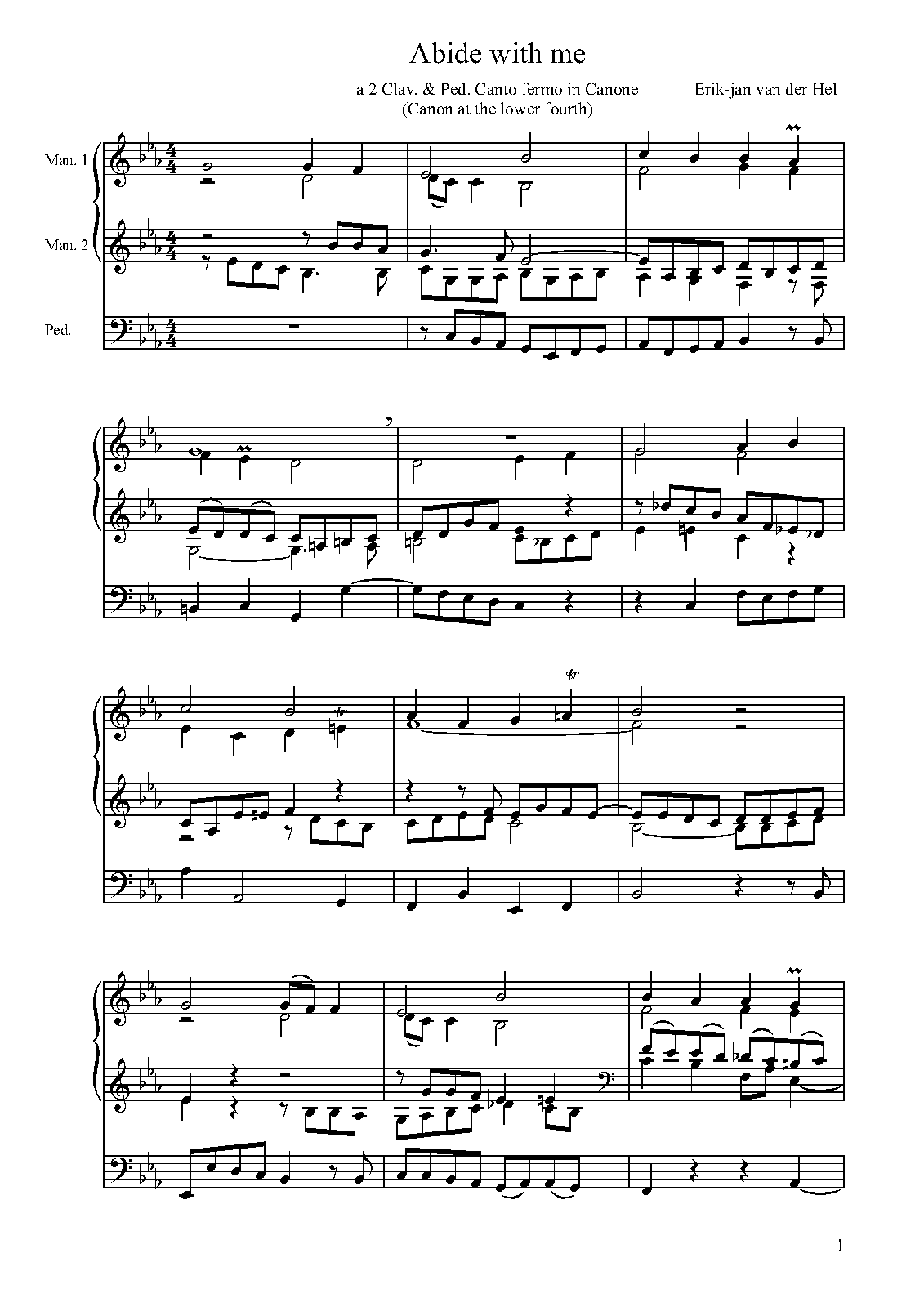 | Extra Information | This Canonic Chorale Prelude on "Abide with me" is written in 2015. The cantus firmus is a canon at the lower fourth. The style of this composition is somewhere between baroque and the early romantic period. Deze canonische koraalbewerking over "Abide with me" is geschreven in 2015. De cantus firmus is een canon in de onderkwart. De stijl van deze compositie is een beetje tussen barok en vroeg-romantiek in. |