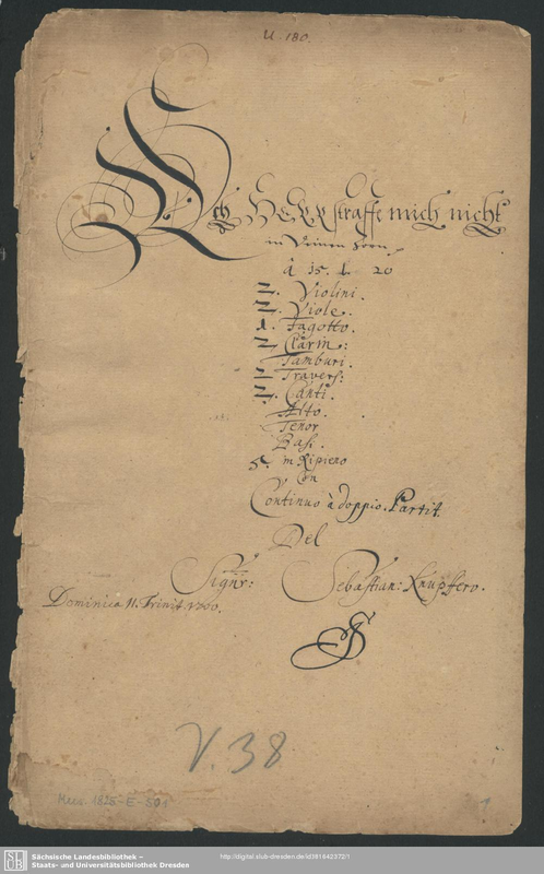 | Instrumentation | Voices: 2 sopranos, alto, tenor, bass Orchestra: 2 recorders, bassoon + 2 trumpets, timpani + 2 violins, 2 violettas + continuo |
