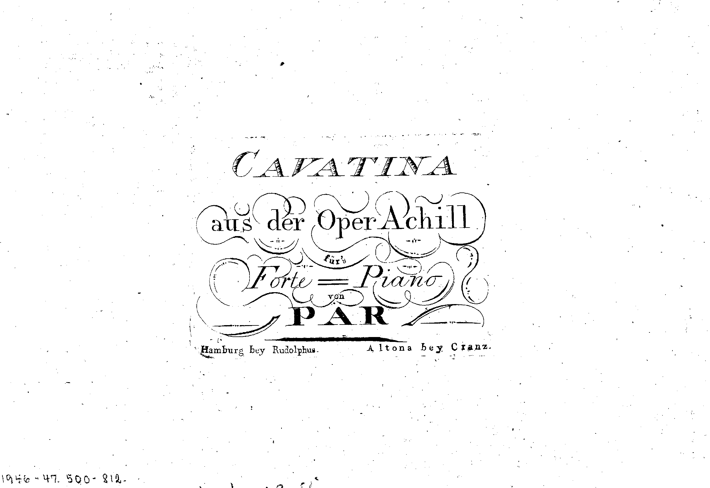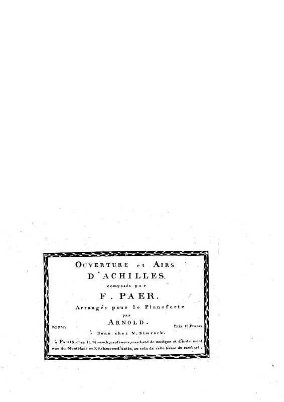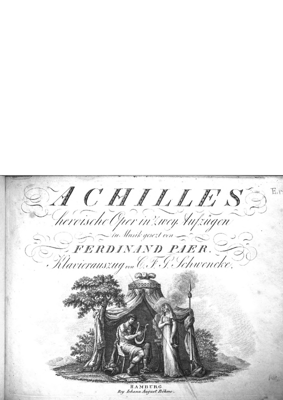 | Manuscript Sources | Dresden Abschrift Full Scores (partially autograph) Information from Abschrift at Ossietzky Library, Hamburg Library of Congress Copy 1860s Dresden Abschrift Abschrift score, short score, (now) incomplete parts used for an 1811 performance in Weimar (however, RISM is probably wrong about it being Genast Jr., if they mean Eduard Genast, who did not debut in Weimar until 1814. See Genast family biography at Raff.org (Eduard's daughter Doris Genast later married Joachim Raff...) Probably Eduard's father Anton Genast performed in Achille instead?) |