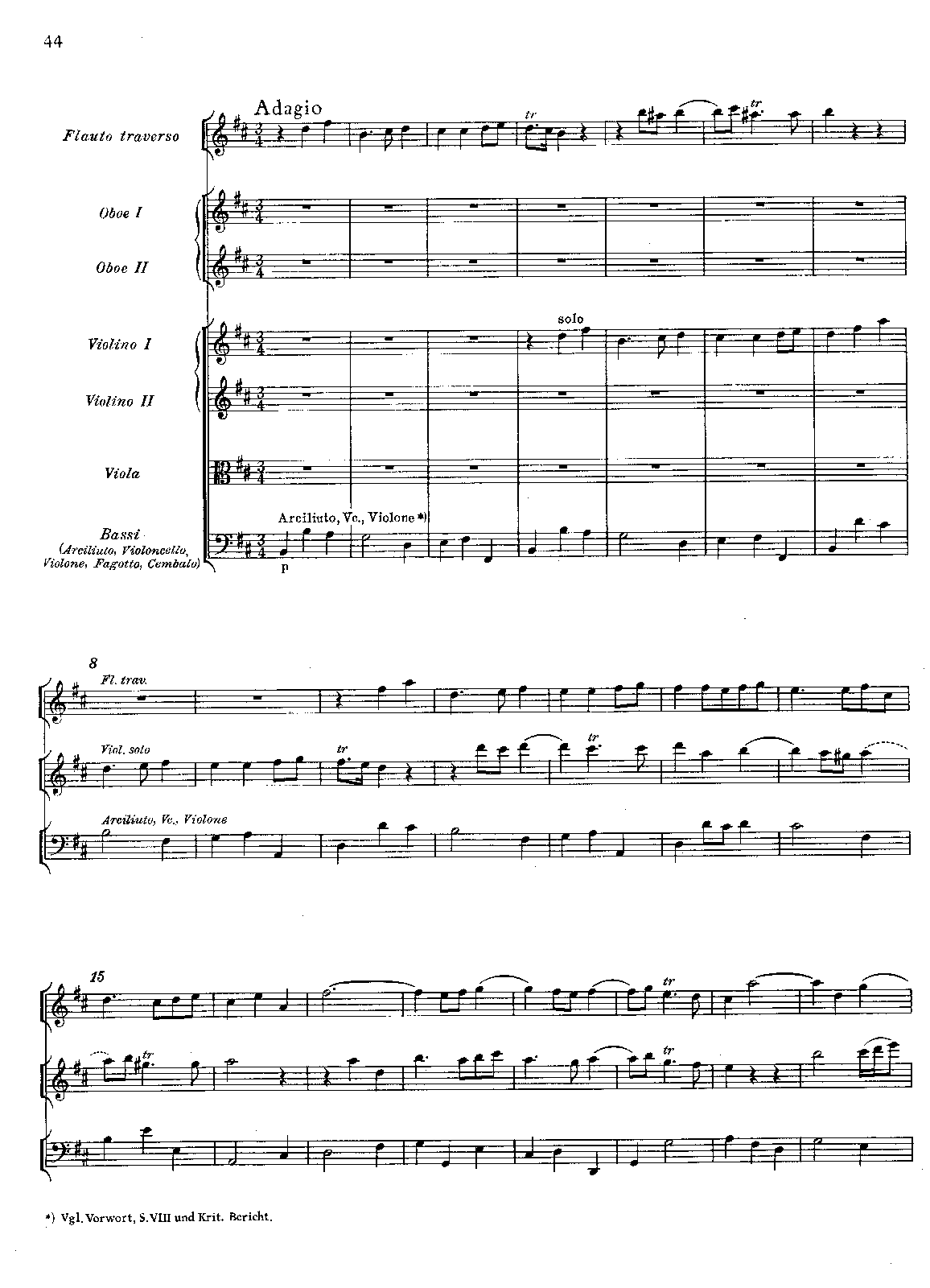 Solo: [in Adagio only] flute, lute, violin, cello, double bass Orchestra: 2 oboes + 2 violins, violas, continuo