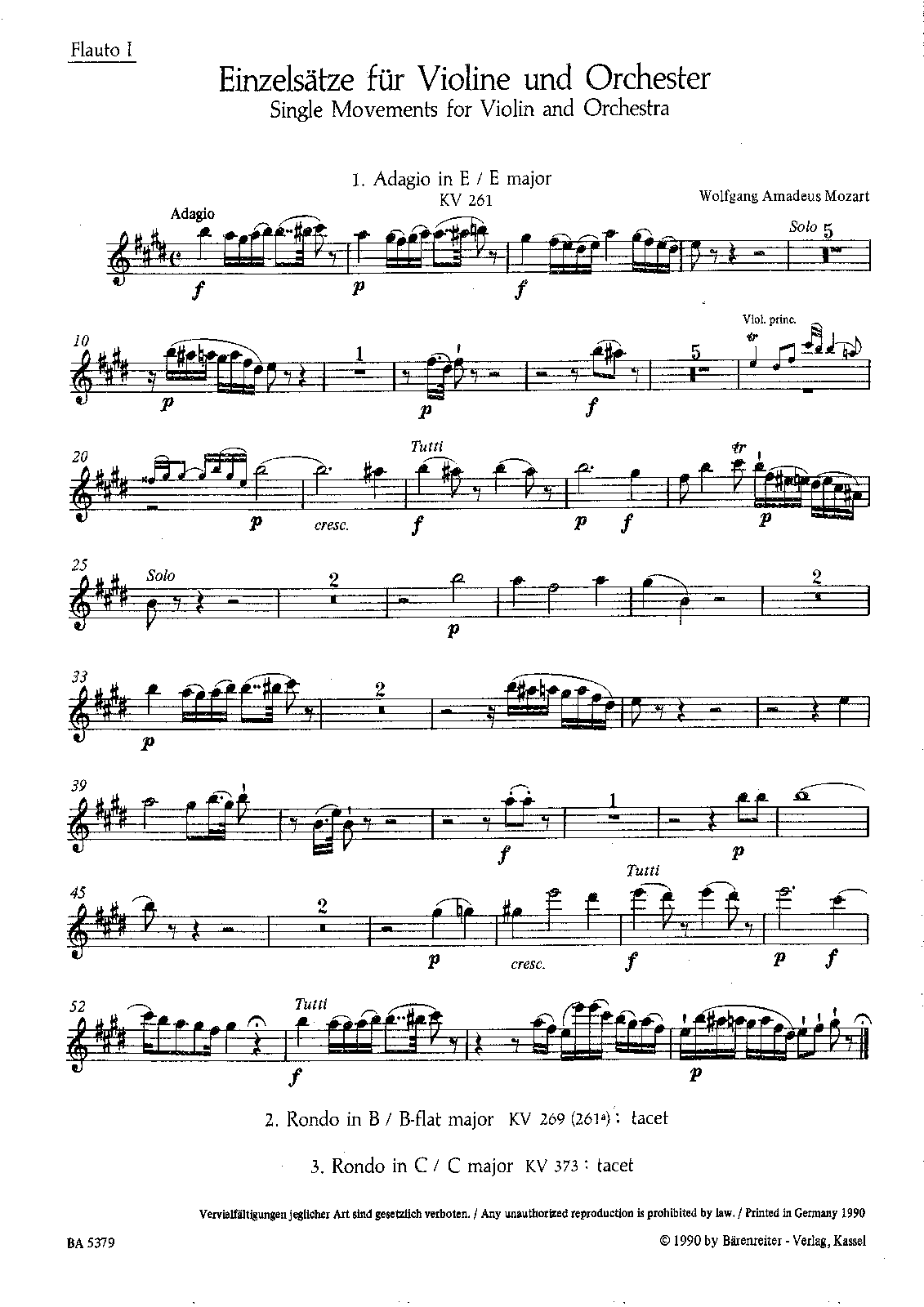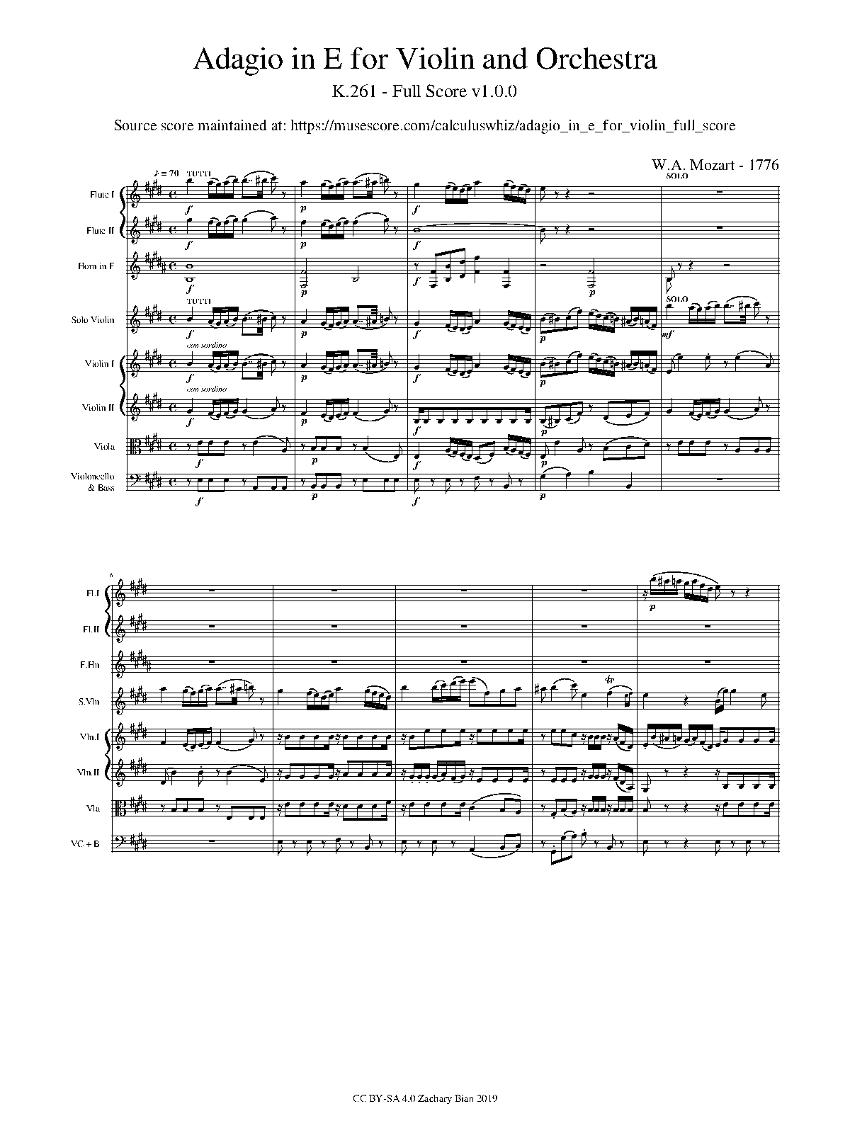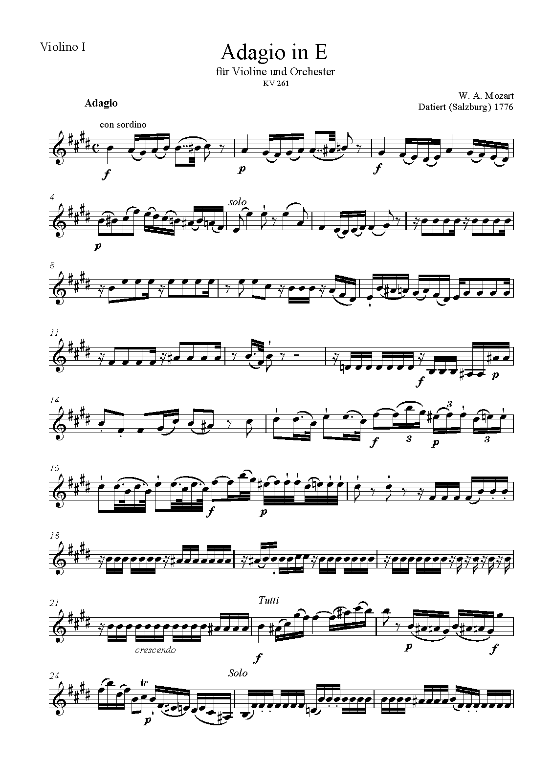 | Name Aliases | ヴァイオリンと管弦楽のためのアダージョ; ヴァイオリンと管弦楽のためのアダージョ ホ長調 K. 261; Adagio en mi mayor para violin y orquesta; KV 261; Adagio; |